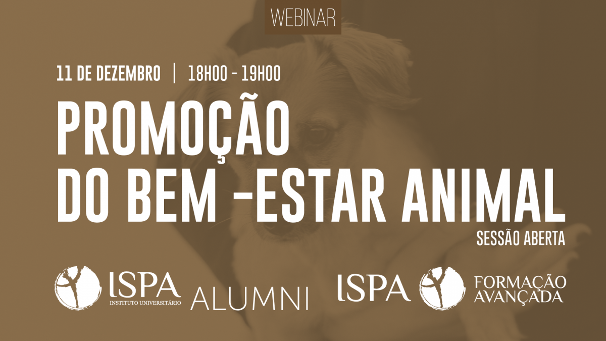 • No dia 11 de Dezembro às 18h, o webinar é dedicado à Promoção do Bem Estar Animal (Sessão aberta), e será conduzido pela equipa que dirige a Pós-Graduação do ISPA com o mesmo nome, Profs. Doutores Rui Oliveira e Leonor Galhardo.
